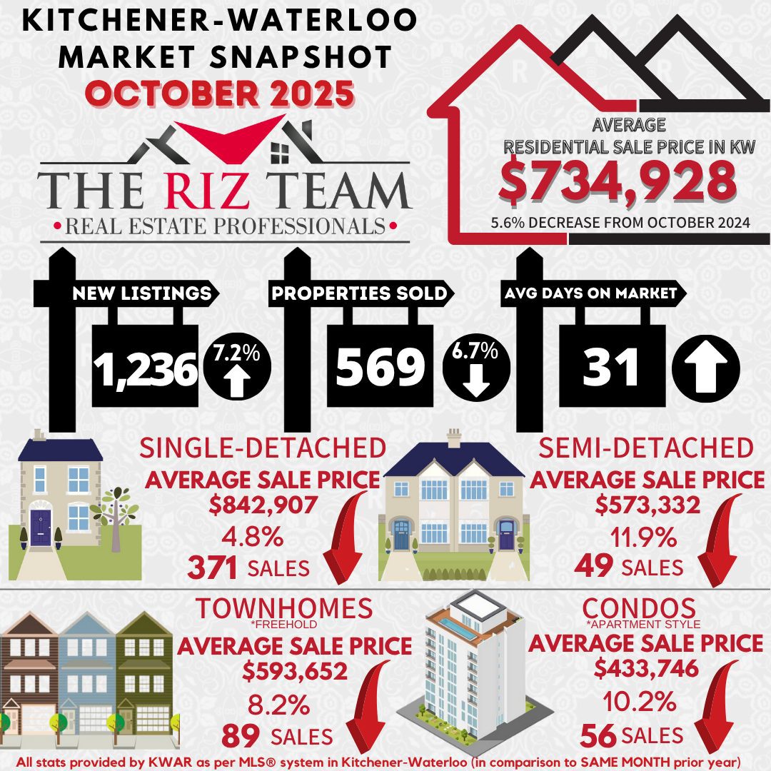 In October, the average sale price for all residential properties in Waterloo Region was $734,928. This represents a 5.6 per cent decrease compared to October 2024 and a 2.4 per cent decrease compared to September 2025.